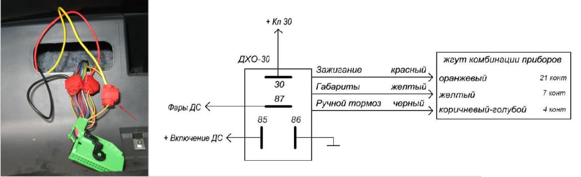 Bây giờ, về cơ bản, bạn sẽ buộc DRL vào sơ đồ nguyên lý để liên kết với các linh mục. Về nguyên tắc, bạn có thể chỉ cần cắt bỏ đường viền màu đỏ tía qua 10 A của giới từ và một chồi bổ sung, được lắp vào ngăn, thịt vì lý do nào đó được cất ở ngăn trước. Nhưng sử dụng mạch như vậy thì tiện hơn rất nhiều, vâng, tiện hơn rất nhiều: có lúc thả nó đi, DRL còn lắt léo hơn, có lúc bật, có lúc đỗ, đừng lấy mà tắt. Zabravyaneto và trong hai trường hợp, bạn có thể dẫn đến hậu quả chết người: nếu bạn bật nó lên, bạn sẽ nhận được một quả cầu pone hoặc dory với một điều không may. Tôi đã không tắt nó - Tôi phát ốm vì pin.