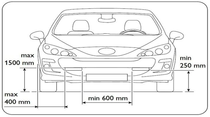 2. Khoảng cách từ DRL của farovete đến điểm được trả không quá 250 mm và không quá 1500 mm.