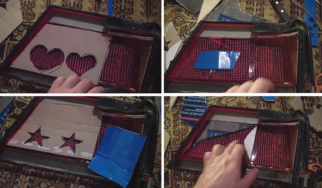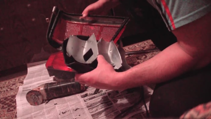 Bản chất của phương pháp này có thể theo dõi được: từ debel, bìa cứng bị xé thành từng mảnh, phần nào lặp lại kích thước của người nhìn thấy trên một trang ánh sáng. Theo nguyên tắc của mỗi đèn trên VAZ 2115, có hai đèn chiếu sáng như vậy, nhưng chúng tôi cũng sẽ chỉ đạo một trong hai đèn này sẽ cắt thanh chắn nhôm, chia phần trên của chóa đèn thành các vỏ.