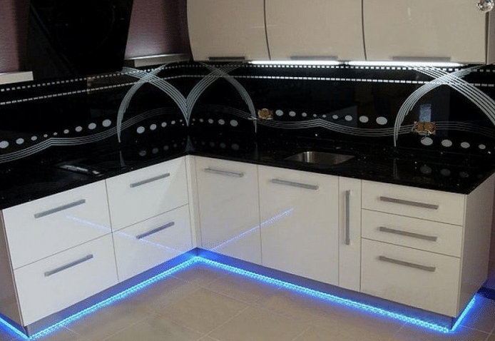 - Kích thước thu nhỏ. Ruy băng và điốt nhỏ gọn không thể nhìn thấy trên nền đồ nội thất nhà bếp, chúng sẽ không làm hỏng nội thất và thiết kế trên tủ và bè, mà ngược lại, chúng sẽ cải thiện nó khi được bật.