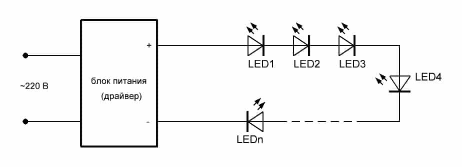 Đi-ốt phát sáng... Nếu có nhiều chất bán dẫn và đèn LED, chúng được kết nối từng cái một hoặc cái khác bắt đầu. Một trong các dây tùy chọn hơi mắc nối tiếp với chất bán dẫn và mắc dây song song. Trong trường hợp này, nếu một diode làm hỏng nó, chuỗi sẽ hết gas. Nyama và sửa chữa thiết bị.