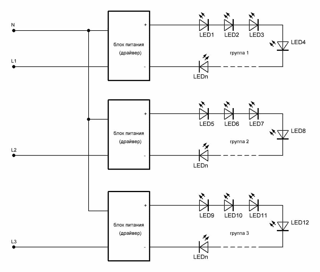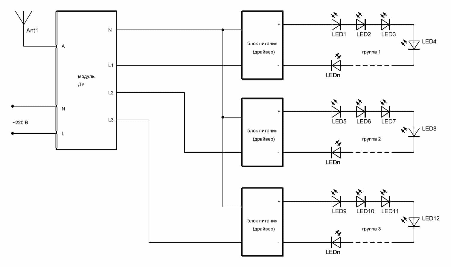 Đèn nhóm (thường là 3) có dây dẫn màu đen (chung) và vàng, trắng, xanh lam (L1, L2, L3). Điện áp ở các cực L1, L2, L3 là 220 V, do đó, trong mạch của chúng tôi, thay vì đèn, chúng tôi sử dụng trình điều khiển LED để bảo vệ các mô-đun bán dẫn.