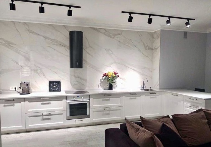 Sơ đồ chiếu sáng trên đồ nội thất, sử dụng đèn để theo dõi, không thêm vào không gian nhà bếp-Tavana những chi tiết không cần thiết. Bất kỳ tùy chọn nào khác, chẳng hạn như các vạch sáng tuyến tính hoặc chấm, tất cả đều được sao chép trên pyrite.